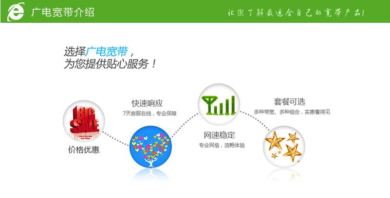 廣電寬帶-- 以速度和內容取勝。帶寬持續升級,步入百兆光速時代,以豐富多彩的內容,全力為用戶奉獻網絡高速優質、價格實惠的家庭寬帶服務產品。
