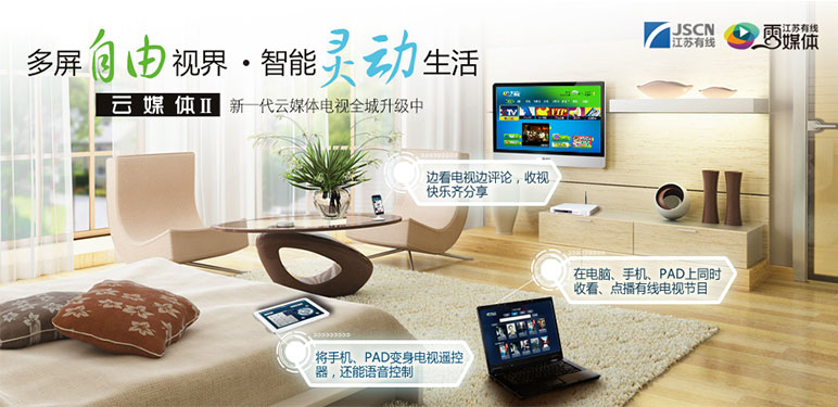 泰州云媒體電視用戶家中的高清互動(dòng)機(jī)頂盒在線升級(jí)成云媒體2后,即可在智能手機(jī)、PAD和電腦上收看、點(diǎn)播有線電視節(jié)目,用手機(jī)、PAD遙控電視,通過語音操控電視、輸入文字等等,以“多屏”和“智能”為特征的云媒體2,給您帶來全新的收視體驗(yàn)。
